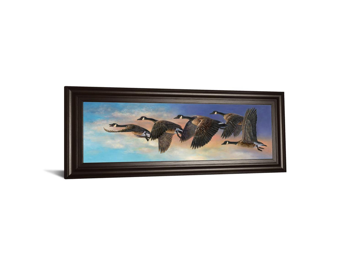 - These geese are very determined against the pink sky; you can almost hear them.