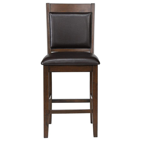 - Designed with a tall backrest, this counter height chair invites one to relax on a padded back and seat cushion, each upholstered in smooth brown leatherette that makes maintenance a breeze