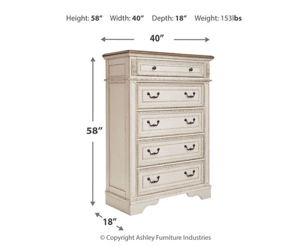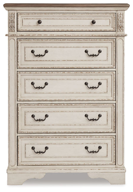 Cómoda de cinco cajones Realyn - Blanca / Marrón / Beige