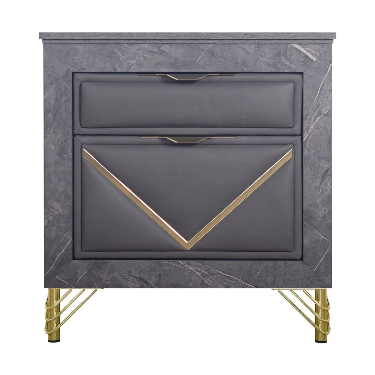 - Glimmering Glamour: Trendsetting gold metal and mylar accents dazzle against the ultra-soft gray fabric drawer fronts, while intricate detailing adds a touch of sophistication to the elegantly designed legs.