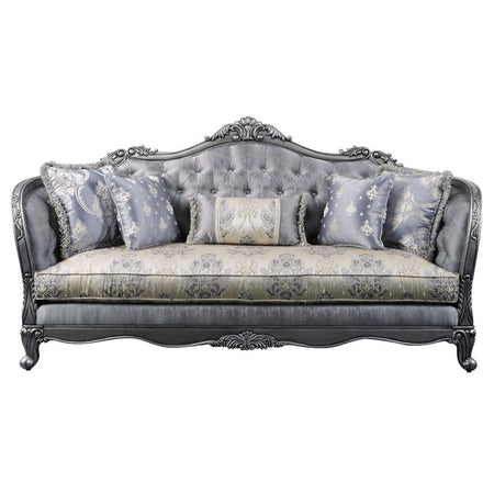 - The Ariadne sofa is fit for royalty! The platinum finish of the wooden frame complements the lustrous upholstery over button-tufted seatback and armrests. Carved flourishes crown the arched seatbacks and extend down the molding around the high shelter armrests. Accent pillows with floral patterns are included.