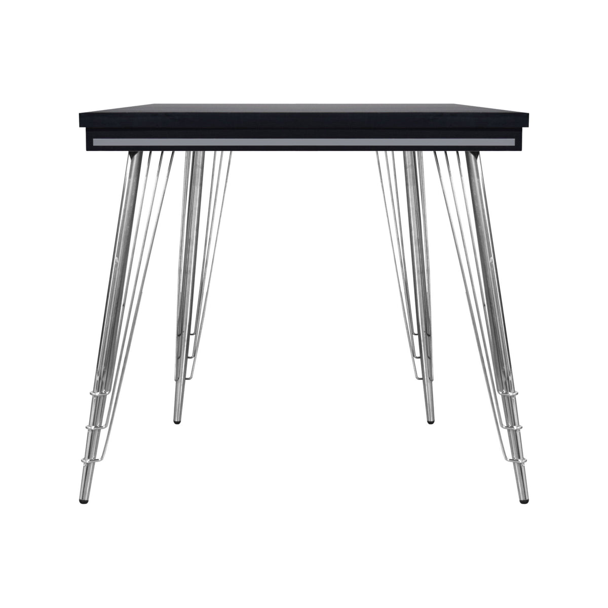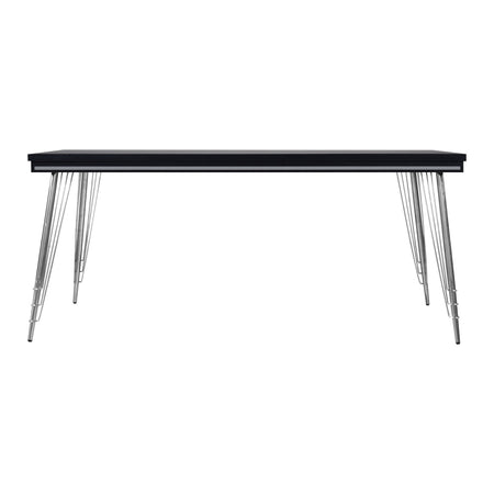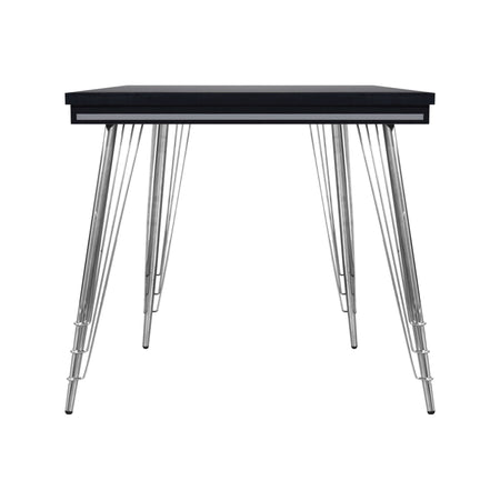 - Contemporary Minimalism: The table features a sleek rectangular black top with clean lines and stainless steel hairpin legs, embodying a minimalist and modern aesthetic.